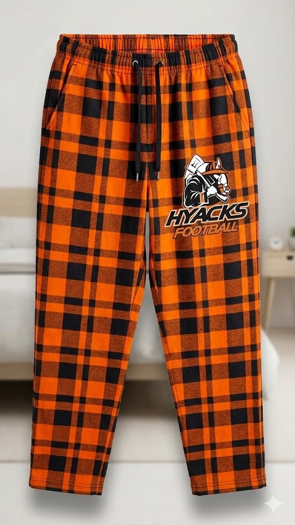 Show your team pride even when you’re off the field with these custom Hyacks Football Spirit PJs. Combining the classic look of a bold orange and black flannel plaid with modern athletic comfort, these are the ultimate lifestyle essential for players, parents, and fans.