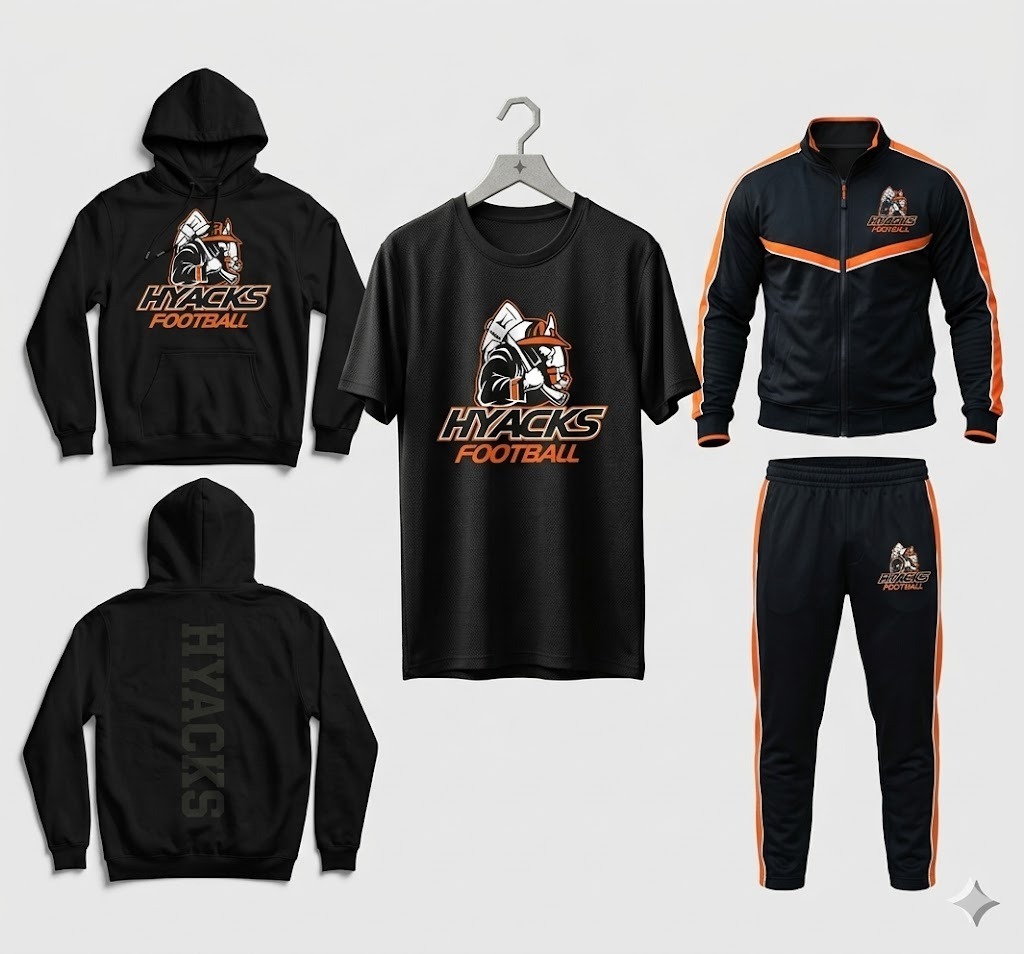 stay sideline-ready with this Hyacks Football tracksuit. Made from a comfortable and flexible blend, this black suit features vibrant orange paneling on the sleeves, a stand-up collar, and orange drawstrings. The official "Hyacks Football" logo and firefighter graphic are on the left chest and left thigh for a bold look.